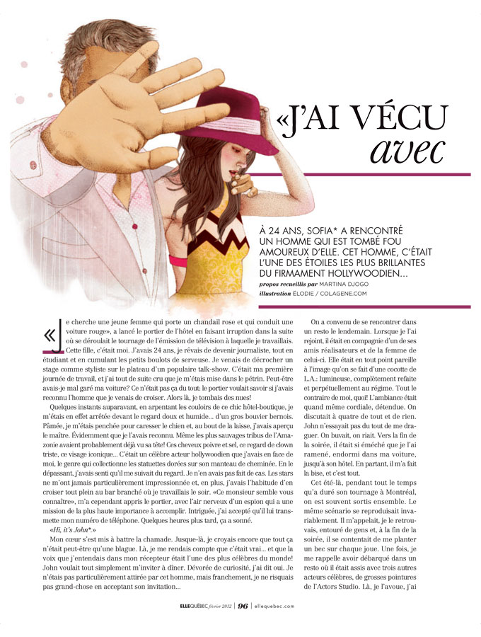 In December, thanks to my agent Colagene, I made make an illustration for ELLE Québec under "Elle se raconte" (true story) to a story about a young Montreal who attended a Hollywood star for a year, published in the February issue 2012.